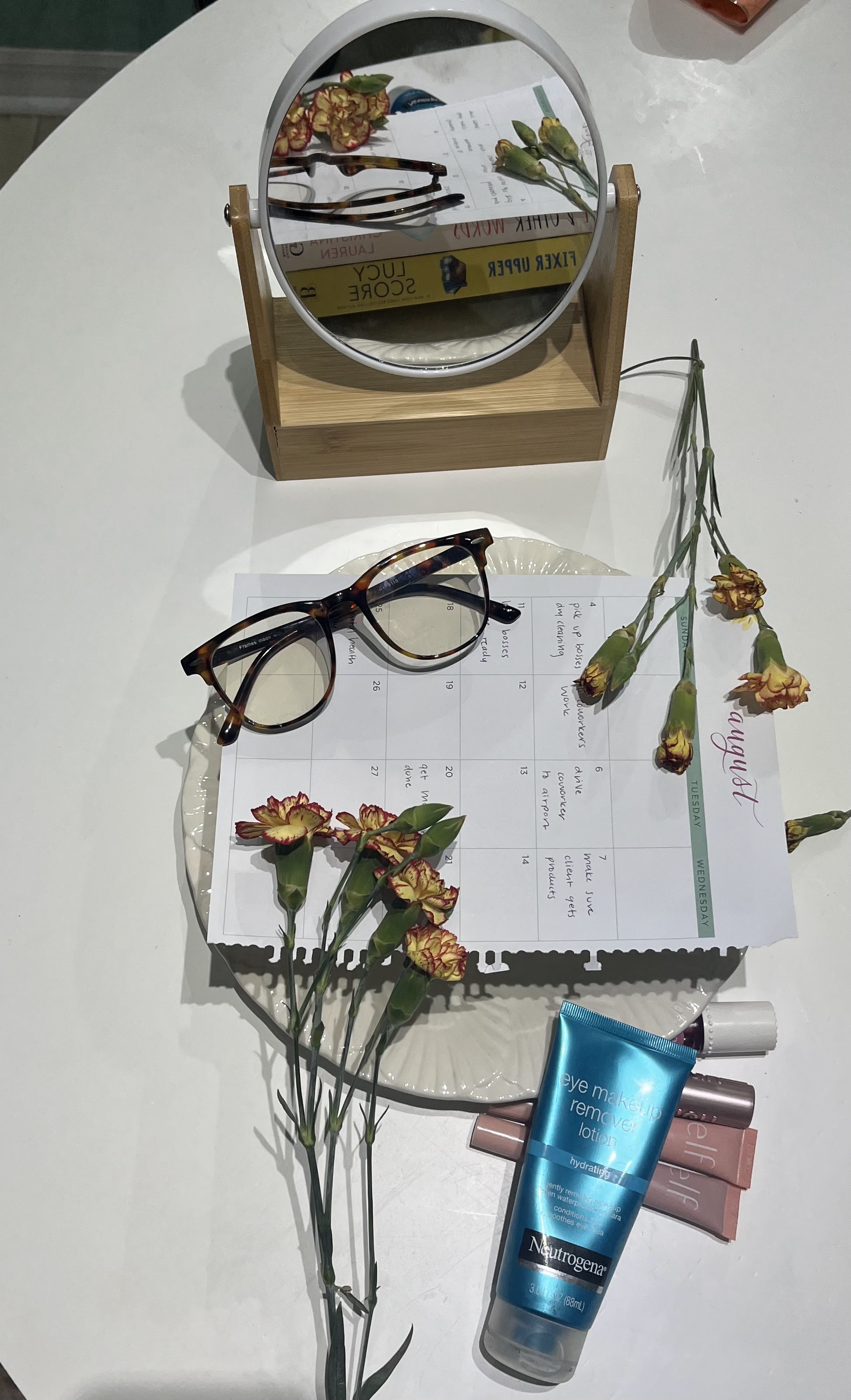 The photograph reflects themes of self love and appreciation. I carefully selected and arranged objects to depict a sense of warmth and happiness. The lightning of the image creates a warm and cozy feeling, esoailly the dark image with the contrast of the candles being lit. The objects chosen have a sense a happiness and self care being them, such as the flowers and the journaling bible reflected in the mirror. The mirror was strategically placed to reflect the spines of the books to represent looking back at oneself in a mirror.